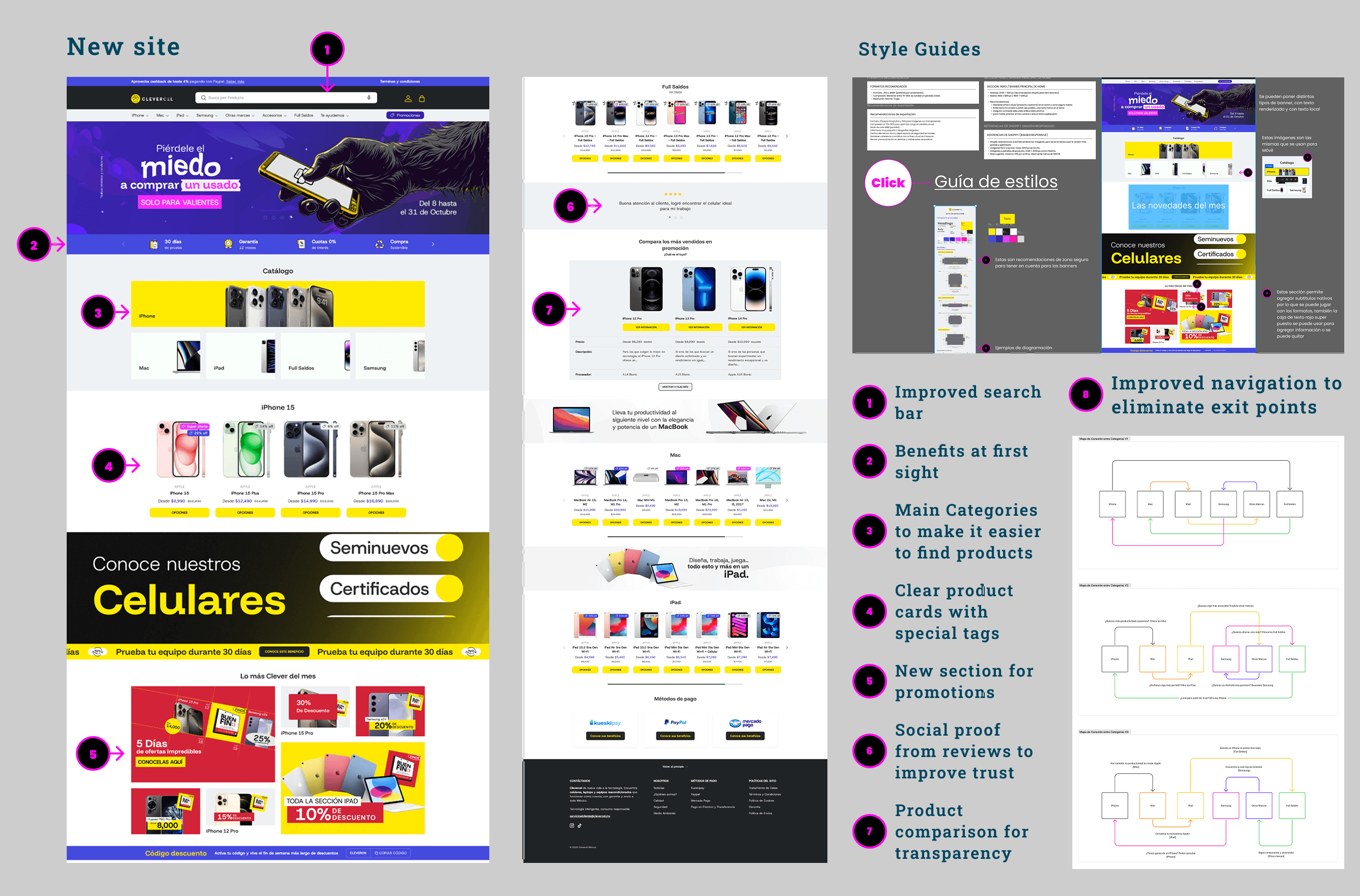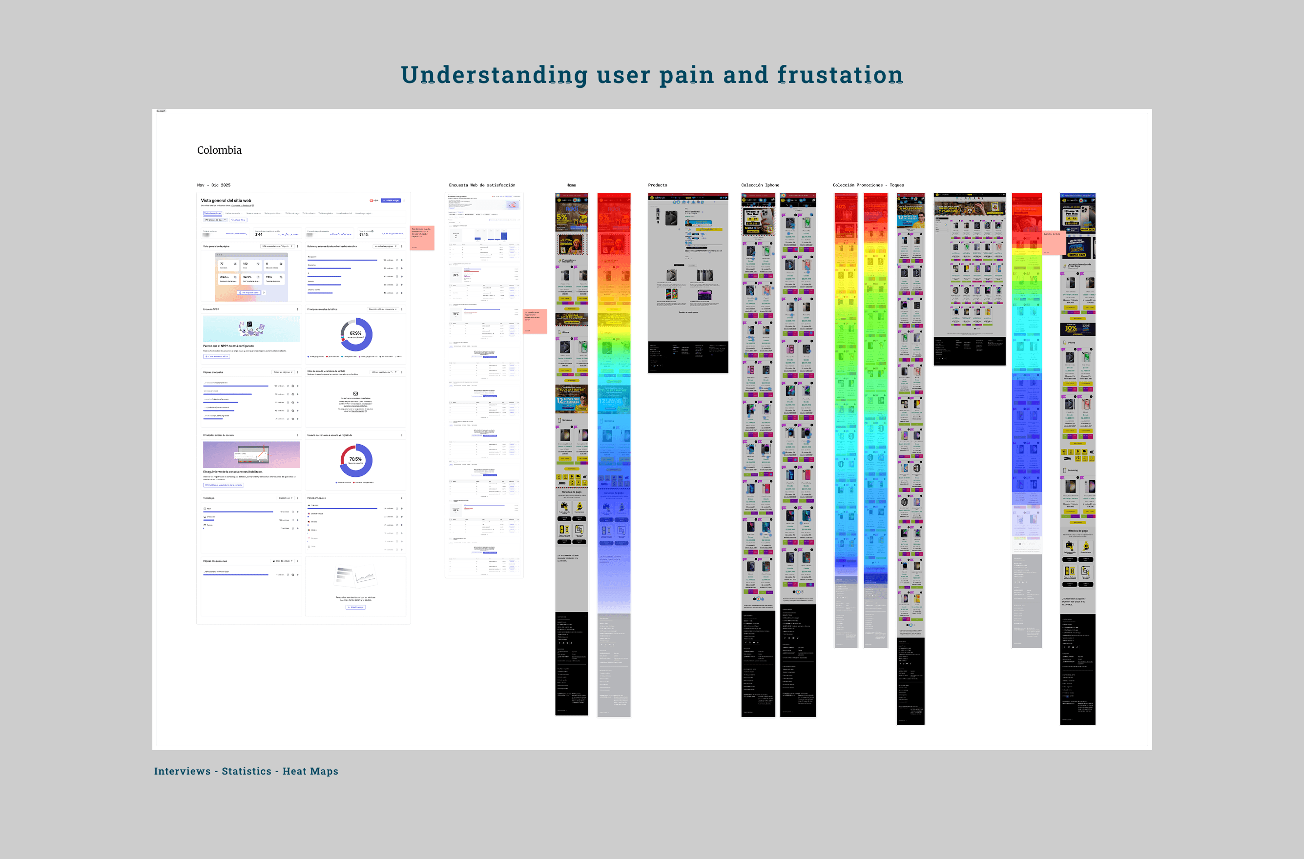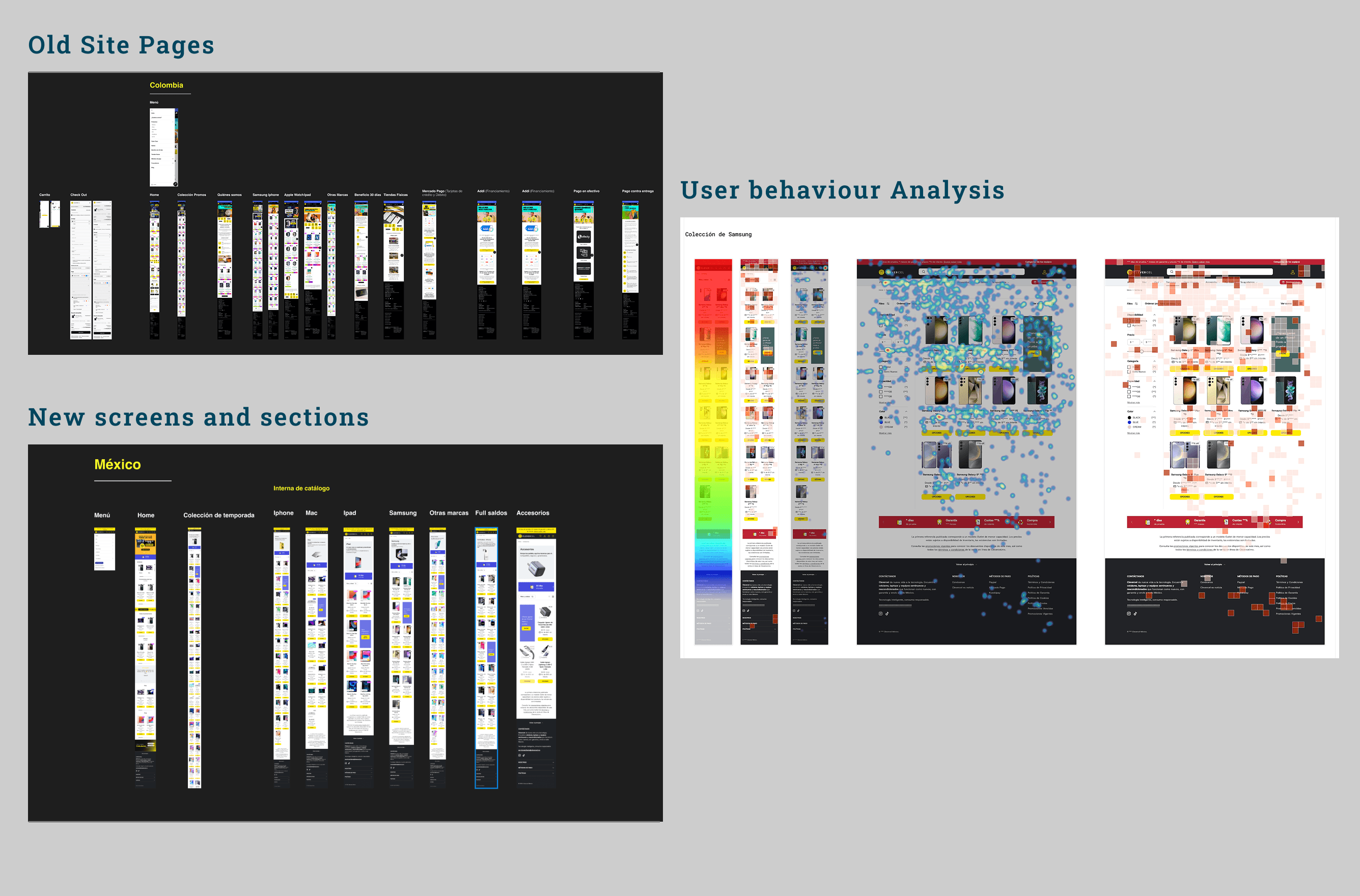 I proposed and executed a Circular Navigation Architecture on Shopify Plus. The core of the solution was interconnecting key categories (iPhone, Samsung, Full Saldos) to leverage visitors' purchase intent. If a user did not find their ideal device in one section, the design organically guided them toward another relevant opportunity through strategic internal links, avoiding dead ends and maximizing product discovery. Discovery-Driven Interface: Implemented product clusters (favorites, most viewed, percentage-based discounts) that invite continuous exploration. Content Optimization: Messaging was adjusted based on actual attention spans detected in heatmaps, prioritizing the benefits users were actively searching for.